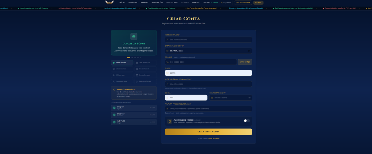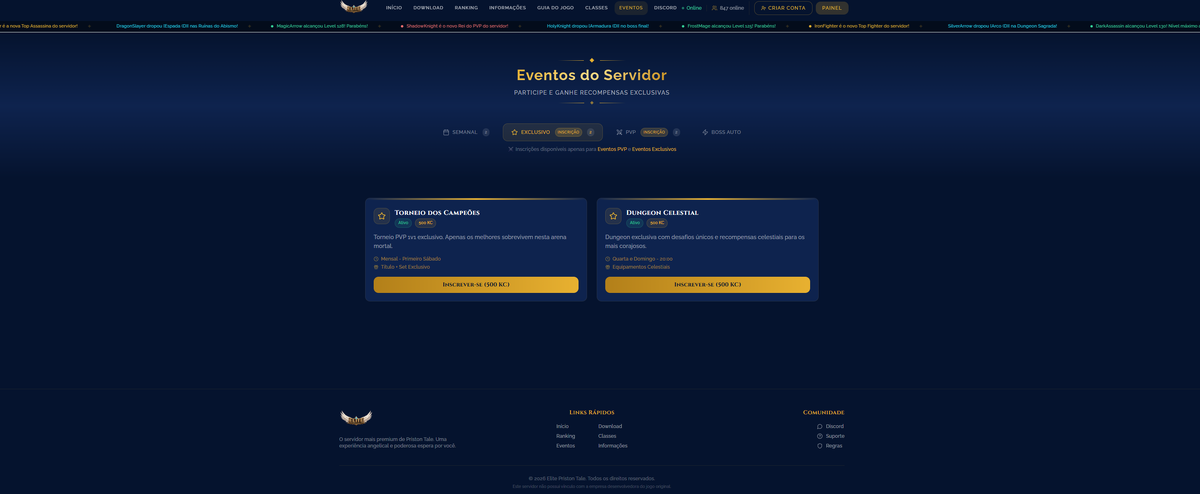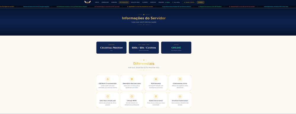 Galera, sou novo na comunidade, trabalho com design, e andei me aventurando em dev para alguns sites de Priston. Sei que aqui é cheio de PRO, não sou profissional na área, porém posso contribuir expondo minhas idéias para um site novo aqui. Tenho outros projetos em fase final, assim como esse, e gostaria realmente de saber opinião de vocês! Lembrando (não sou profissional - LONGE DISSO). 📄 Descrição Site exclusivo para seu servidor, desenvolvido na plataforma Base44, com foco em apresentação profissional, organização de conteúdo e conversão de jogadores. Layout moderno, visual imersivo e estrutura pensada para destacar seu servidor desde o primeiro acesso. ⚙️ Informações Técnicas *Desenvolvido na plataforma Base44 *Estrutura baseada em componentes e seções modulares *Layout 100% responsivo (PC e mobile) *Código gerenciado pela plataforma (não exportável diretamente) *Publicação online integrada (não precisa de hospedagem externa) 🧩 Funcionalidades *Página inicial com destaque visual (Hero Section) *Seção de informações (rates, sistemas, diferenciais) *Botões estratégicos (download, acesso rápido, etc) *Navegação simples e intuitiva *Estrutura preparada para expansão de conteúdo (Podendo acrescentar novidades) 📦 Entrega *Acesso completo ao projeto dentro do Base44 *Site já publicado e funcional *Total liberdade para edição e personalização na plataforma 💡 Indicado para: *Donos de servidores de Priston Tale *Quem quer um site profissional sem precisar programar *Projetos que buscam mais credibilidade e retenção de players =============================================== Deixei em anexo alguns vídeos do site, até finalizar ele algumas coisas serão alteradas! (Site tem muito mais funcionalidades e paginas do que os prints e videos enviados aqui). Desde já agradecido pela atenção de vocês! 🙏 01.mp4013.mp4
